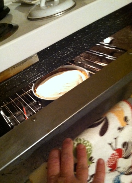 I mixed it all up, put it in my carefully grahamed spring form pan, and then placed it oh so gently in my oven .