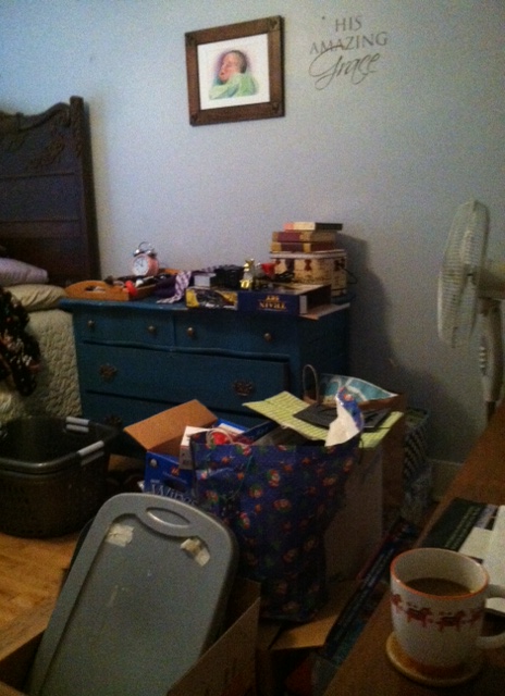 The room above is what we like to call the “Blue Room.” Not because each time I walk into it I start muttering despair (which I do) but because the walls are, like, BLUE. Yep, I know. We are suuuuper creative at Momsie house. Right now, the Blue room is stuffed full of The Boxes that Held Christmas. And laundry that keeps fooling around and procreating. But hey! There’s my coffee cup!! From three days ago! I just spotted it! I have been looking all over for that thing!