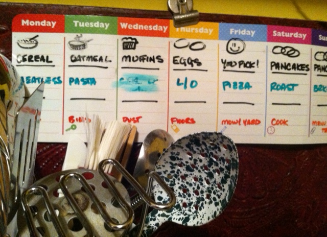 4.  Have a fuel plan:  In my house, we have a daily breakfast and dinner menu that is SOLID.  This simple little posting has saved me many mornings from fuzzy thinking. Fuzzy thinking like asking (at 7:45 am) “What do you want for breakfast, my sweet darlings?”  I know.  So not a good idea.  If you really feel like they should have some sort of (fake) say in their world, have them work up the menu plan with you.