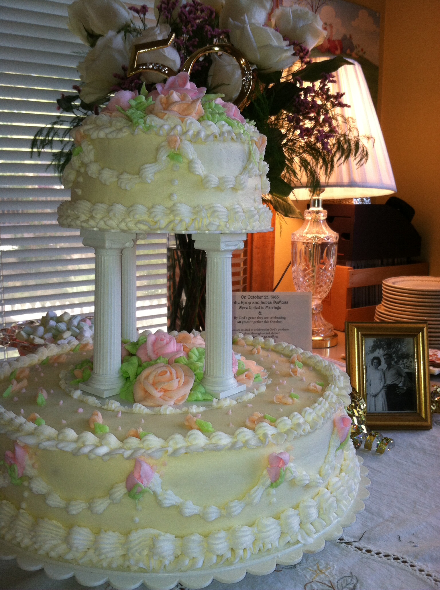 My folks had their fiftieth anniversary not long past, and she made them that cake.  The one above– See it?
