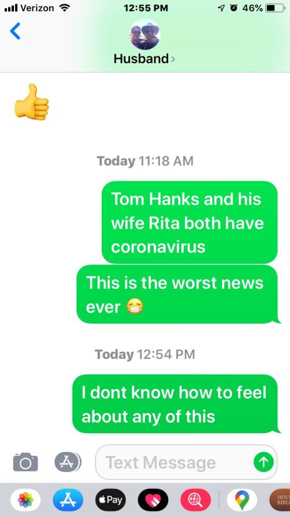 I kept thinking of funny things today. And I kept not posting them because, well, I’ve turned a corner I think. I understand the fear. I understand how we are shutting down March Madness and schools and people are stockpiling supplies. We don’t know how to feel about any of this.